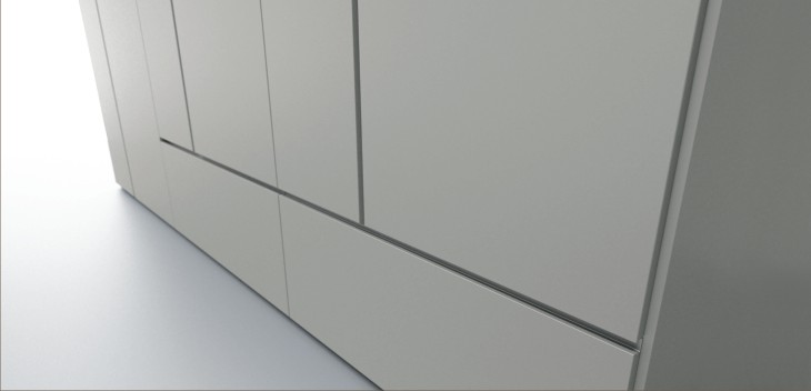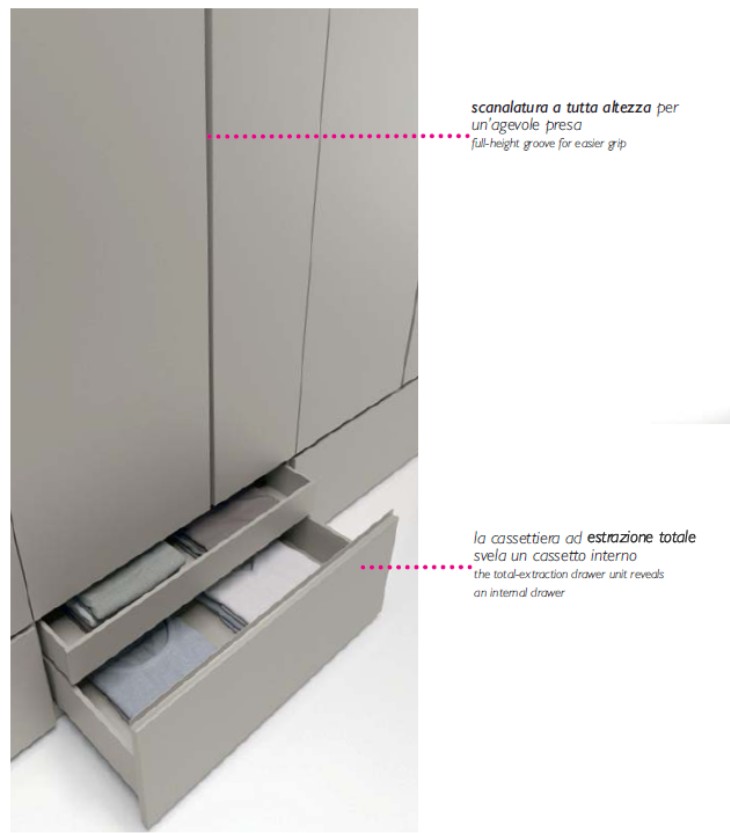 Le scanalature sui profili di ante battenti e cassettoni permettono di aprire comodamente l’armadio senza interrompere la purezza delle facciate lisce con maniglie.