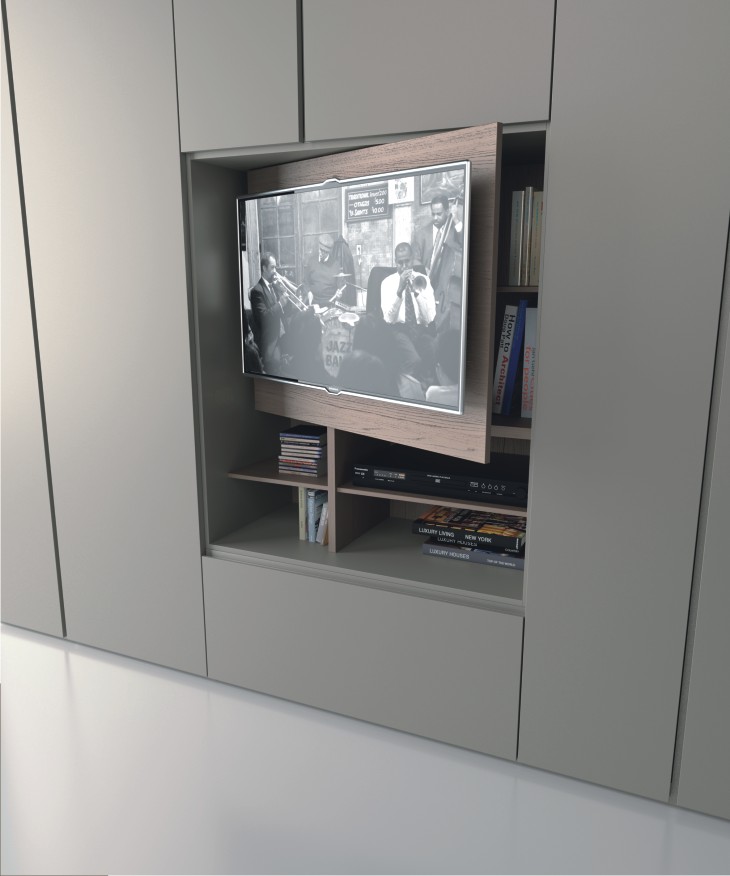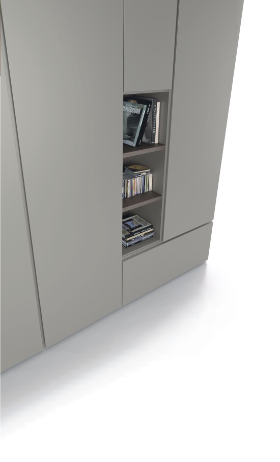 Combinando anche la possibilità di inserire vani a giorno e pannello tv nell’armadio si ottiene una grande varietà di giochi di volume, colori e superfici da studiare sulla facciata dell’armadio, con effetti grafici inediti.