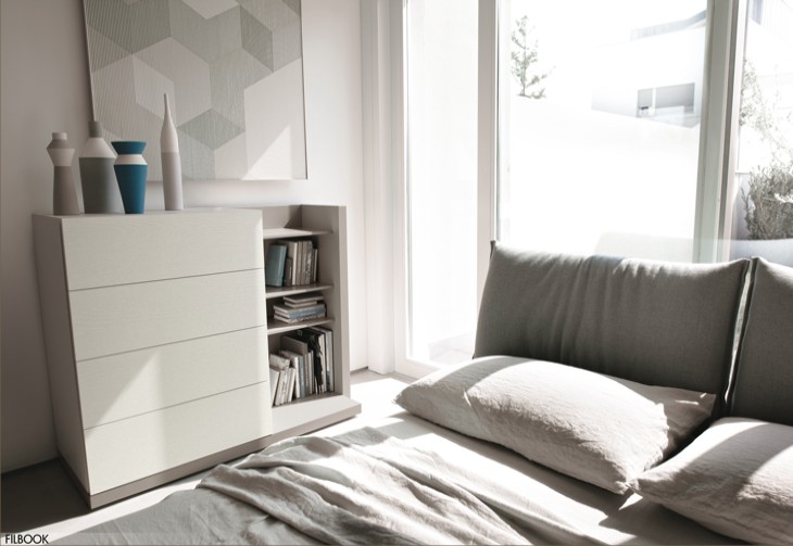 Filnox è un sistema flessibile per costruire comodini, comò e gruppi notte coordinati, con cassetti, contenitori, piani di appoggio e mensole a uso libreria (Filbook), fino a integrare il piano scrivania (FilDesk).