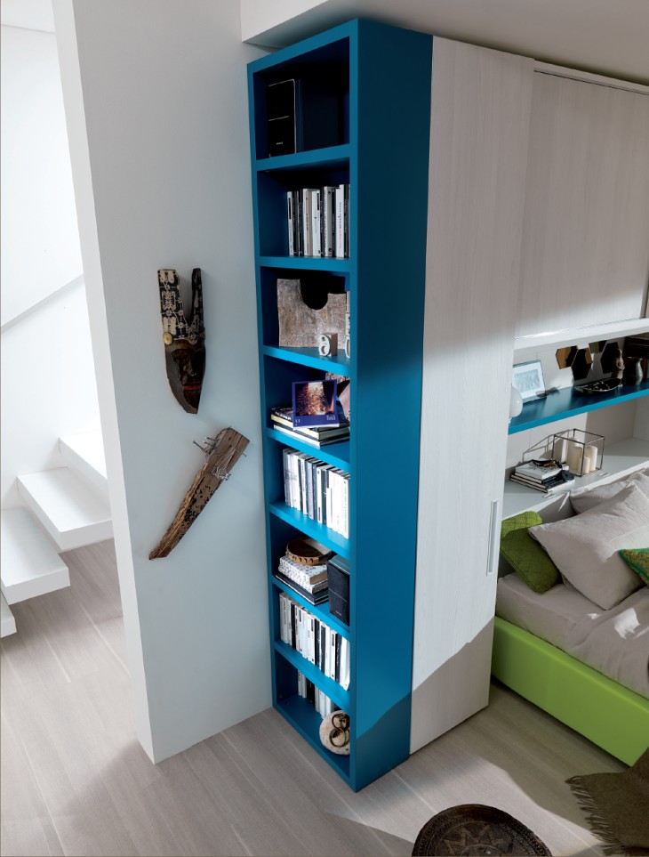 Arredamento pensato con un’armadiatura semlice e leggera: una colonna laterale con due ante battenti e un armadio a ponte scorrevole sorretto di lato da una libreria a giorno. Sotto il ponte trova spazio una mensola e un’elemento retro letto che unisce la funzione di comodino a quella di contenimento (con anta a ribalta), ideale per cuscini e piumoni. Il letto è un sommier imbottito con contenitore, presentato in ecopelle verde acido, che spicca per personalità e ravviva la stanza, in abbinamento alla libreria azzurro petrolio.