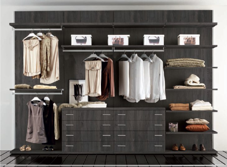 Vediamo proposta la cabina armadio Doimo con pannellatura e ripiani in legno olmo lava, una finitura che riprende il più tradizionale wengè con un gusto cromatico più moderno, in versione lineare.