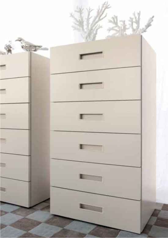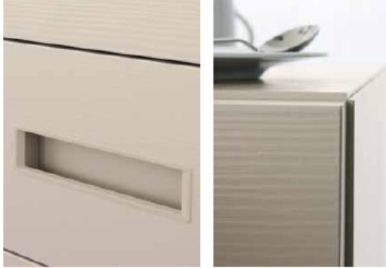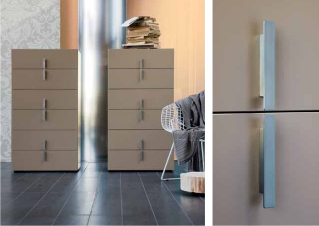 • Serie Quarantacinque Zen: la maniglia è una linea centrata, con un gioco di tratteggio verticale che rompe lo schema orizzontale delle cassettiere.