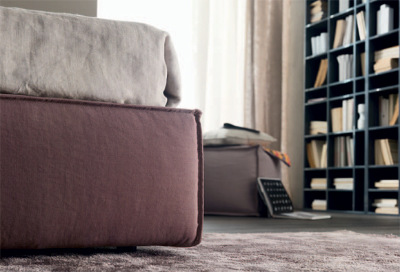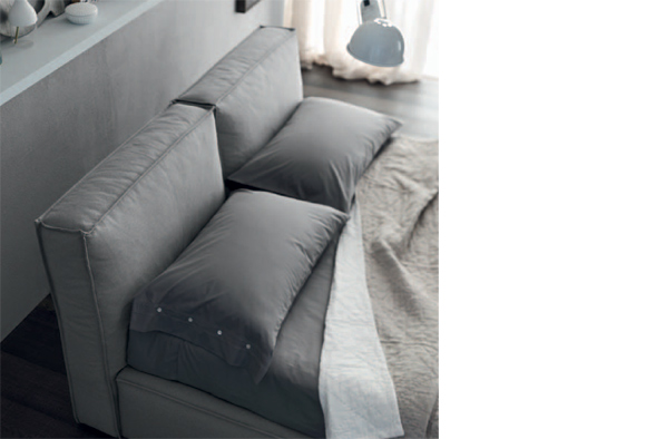 Quando la morbidezza incontra il design: Ennerev presenta un letto matrimoniale imbottito, caratterizzato dallo spessore del giroletto e dei cuscini sulla testiera, sottolineati da robuste cuciture a vista. Per una testiera ancora più soffice si possono avere i cuscini imbottiti in vera piuma.