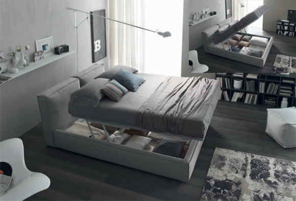 Questo letto può avere il box contenitore celato nella sua struttura ed eventualmente anche il meccanismo di alzata tipo Easy-Up per accedere più comodamente al vano contenitivo e anche per rifare il letto senza chinarsi, grazie al doppio movimento. Grazie al sistema di pistoni il movimento del contenitore è comodo e senza sforzo.