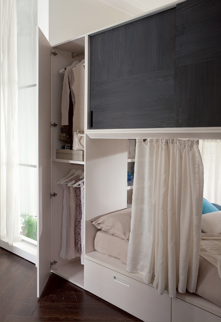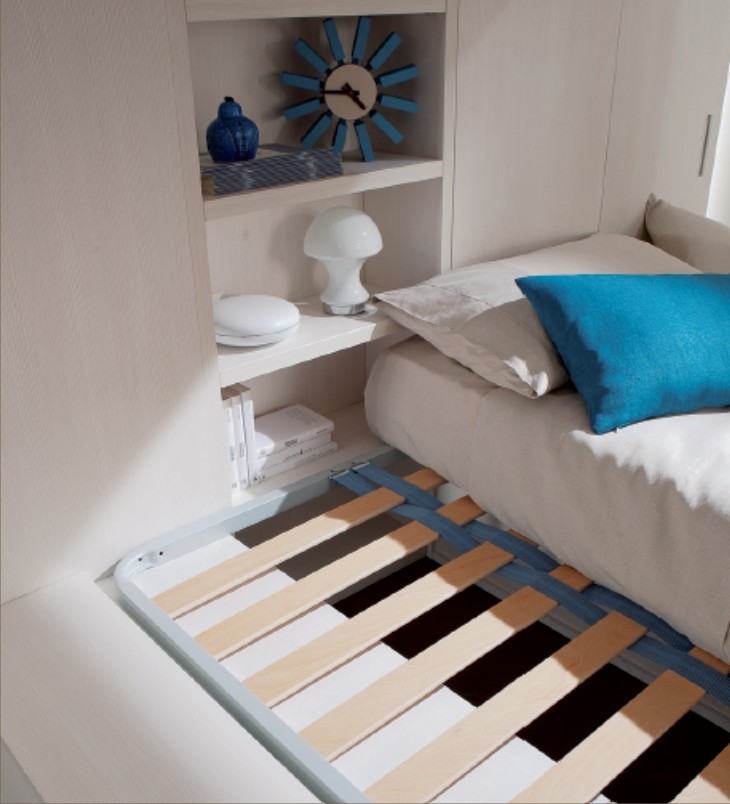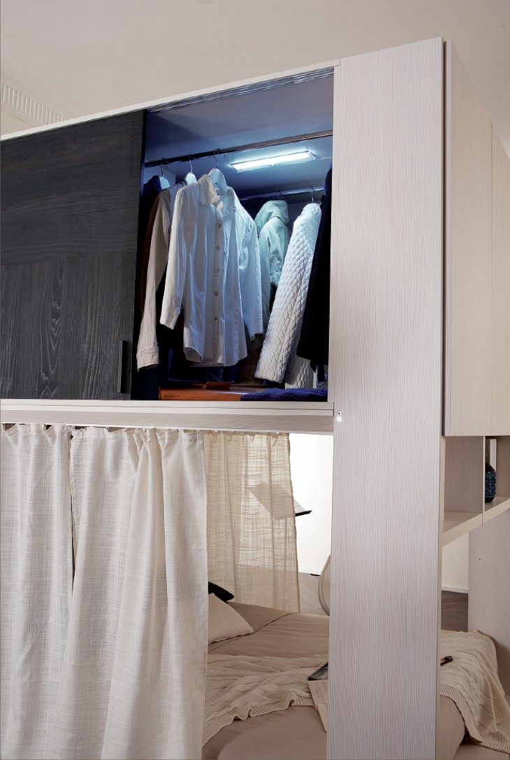 Un ambiente progettato con tutte le funzioni di una normale camera: riposo e contenere, ma sviluppato in un modo alternativo che interpreta una voglia di originalità e di anticonformismo delle nuove generazioni… Molto di più di una semplice camera a ponte matrimoniale con il suo armadio capiente e la soluzione razionale che sfrutta ogni spazio. Il ponte scorrevole da un lato ha profondità maggiore dell’armadio e può contenere anche valige, scatoloni e oggetti voluminosi. La tendina crea uno spazio notte in privacy, per riposare serenamente sotto il ponte nella propria intimità.